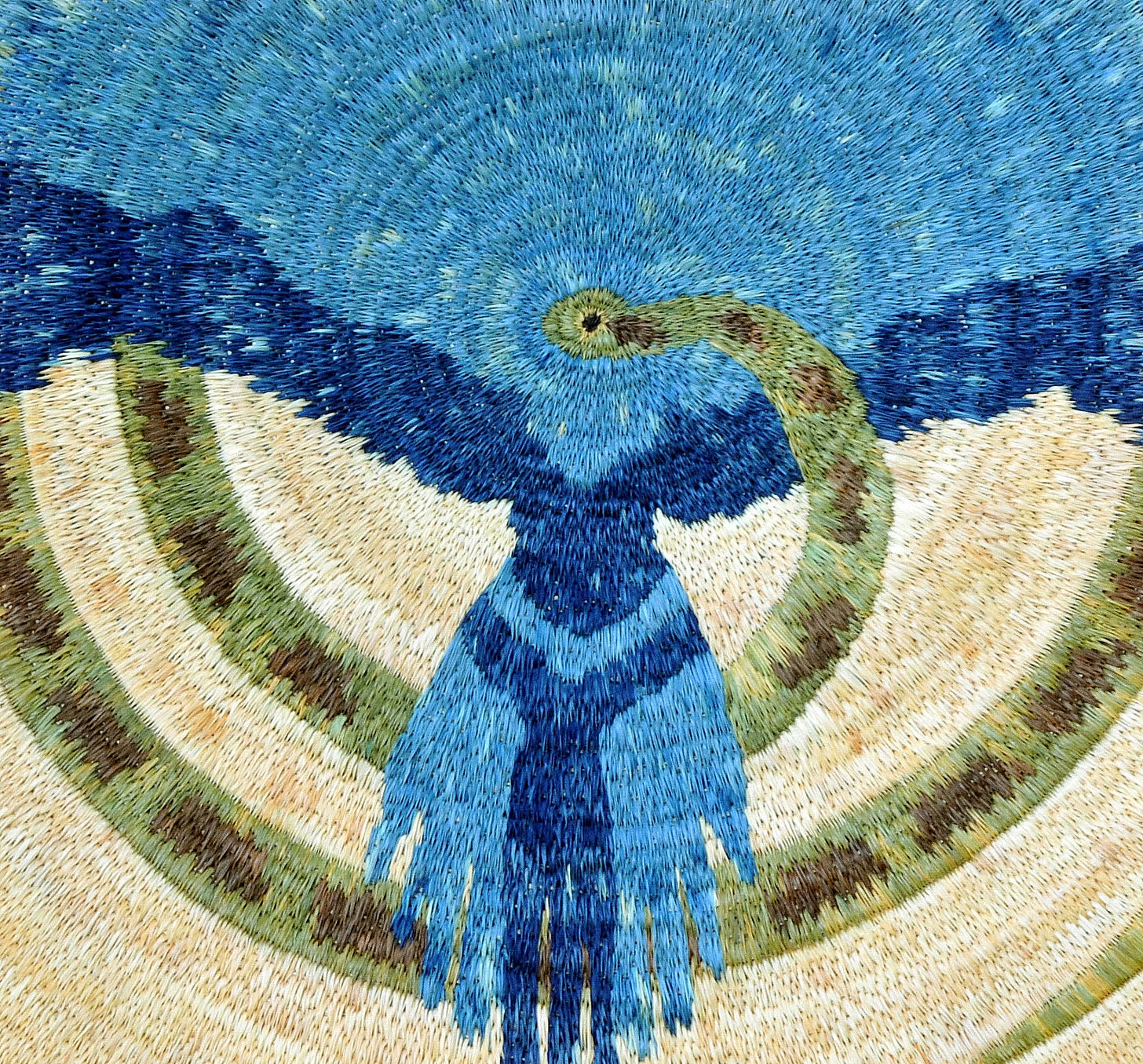 Pattern: The uroboros is an ancient symbol of wholeness portrayed by the circular image of a serpent with its tail in its mouth. The pattern of the basket represents my visualization of the uroboric Mother, one of the manifestations of the archetype of the Great Mother. The uroboric Mother functions as male and female, and above and below. She is symbolized in her spiritual aspect as a bird and in her earthly aspect as a serpent.